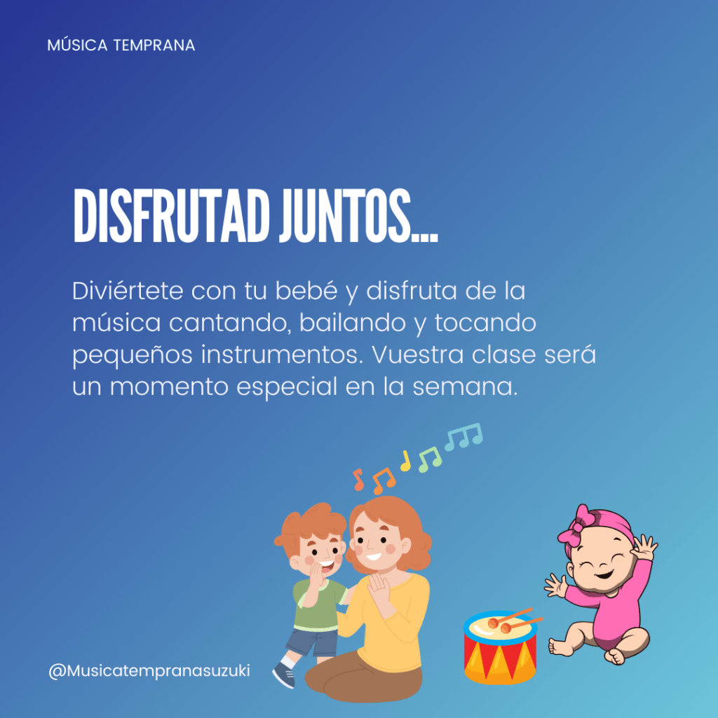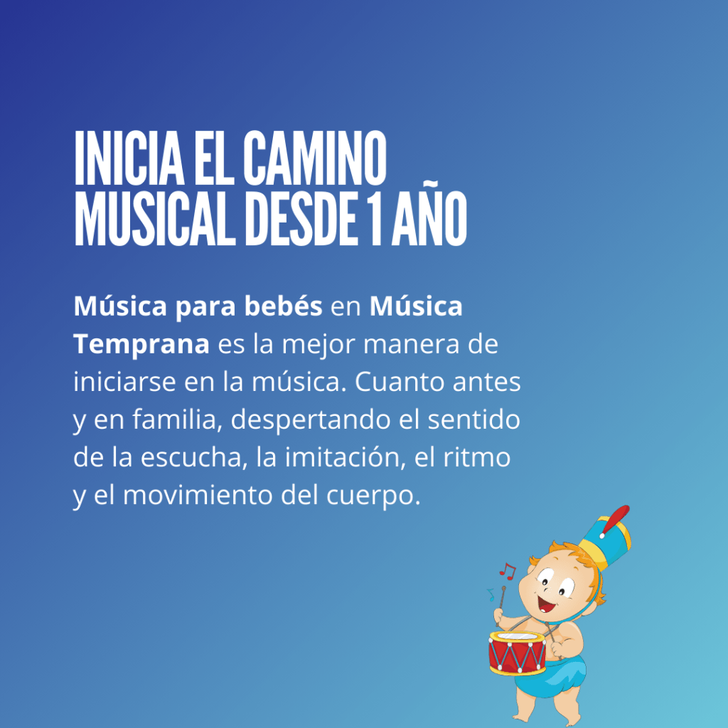 Una sesión semanal de 40 minutos, acompañados de un adulto (madre, padre u otro familiar) en la que se desarrolla la conciencia del sonido y del ritmo a través de la reacción con el cuerpo y el movimiento por medio de canciones, juegos y pequeños instrumentos de percusión.